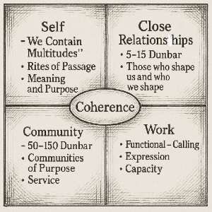 At the heart of the view is our relationship with work. I have considered several terms, and have settled, for now, on the idea of coherence - our sense of ease when it comes to how we relate to ourselves, our surroundings, and the elements that comprise our work.